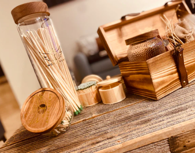 This set is to remind you that you are always self sustained! Like this set, composed of recycled food cans, soy wax, scented by essential oils inside a beautiful unstained wood box.